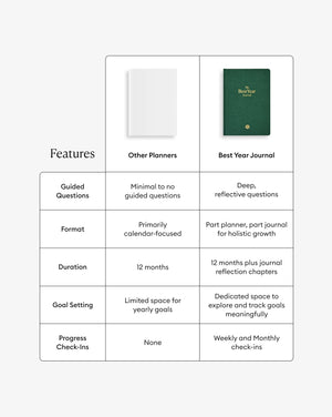 This is a journal-planner hybrid for creating a year of clarity and growth. With updated 100+ prompts, it guides you through reflecting on the past year, setting meaningful intentions, and transforming them into actionable steps. Weekly reviews help you stay on track and adapt as you go. No pressure, just steady progress.