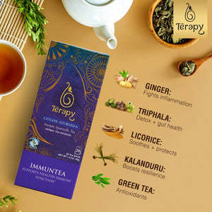 Terapy Teas is an artisanal wellness tea brand that blends premium Pure Ceylon tea with Ayurvedic botanicals, all 100% natural with no artificial colorings, flavors, or preservatives.